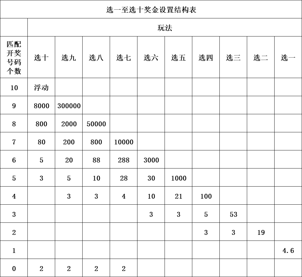 (一)“选十”玩法。若投注号码与当期开奖号码中的任意十个号码相同,中得浮动奖;若投注号码与当期开奖号码中的任意九个号码相同,即中奖,单注中奖金额8000元;若投注号码与当期开奖号码中的任意八个号码相同,即中奖,单注中奖金额800元;若投注号码与当期开奖号码中的任意七个号码相同,即中奖,单注中奖金额80元;若投注号码与当期开奖号码中的任意六个号码相同,即中奖,单注中奖金额5元;若投注号码与当期开奖号码中的任意五个号码相同,即中奖,单注中奖金额3元;若投注号码与当期开奖号码全部不同,即中奖,单注中奖金额2元。